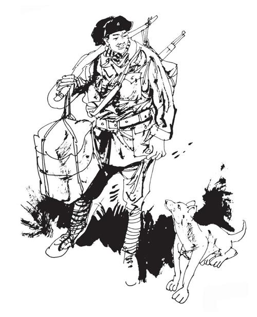 大雨是连队的第一批兵,当上司第二年接任司务长,八百里荒漠他走得最勤,也最老到,是连队外事活动第一人。他说从路上捡了一条小狗,并带回来养着,连队里几乎没有反对声音。兵们当然喜欢,在这个除了人是主要的活物以外的寂寞区域,有一种较通人性的异物供大家把玩,确是奢望。可连长还是说了一句:“连人都快养不活了,还养狗?”那年月真是这样。大雨没有吭声,下米时朝锅里扔了几粒白砂。正应了“一人吐一口,养条大肥狗”的说法。这条后来被称作“贵妃”的小母狗,就是堂而皇之地吃着兵们吐的砂裹饭长大的。