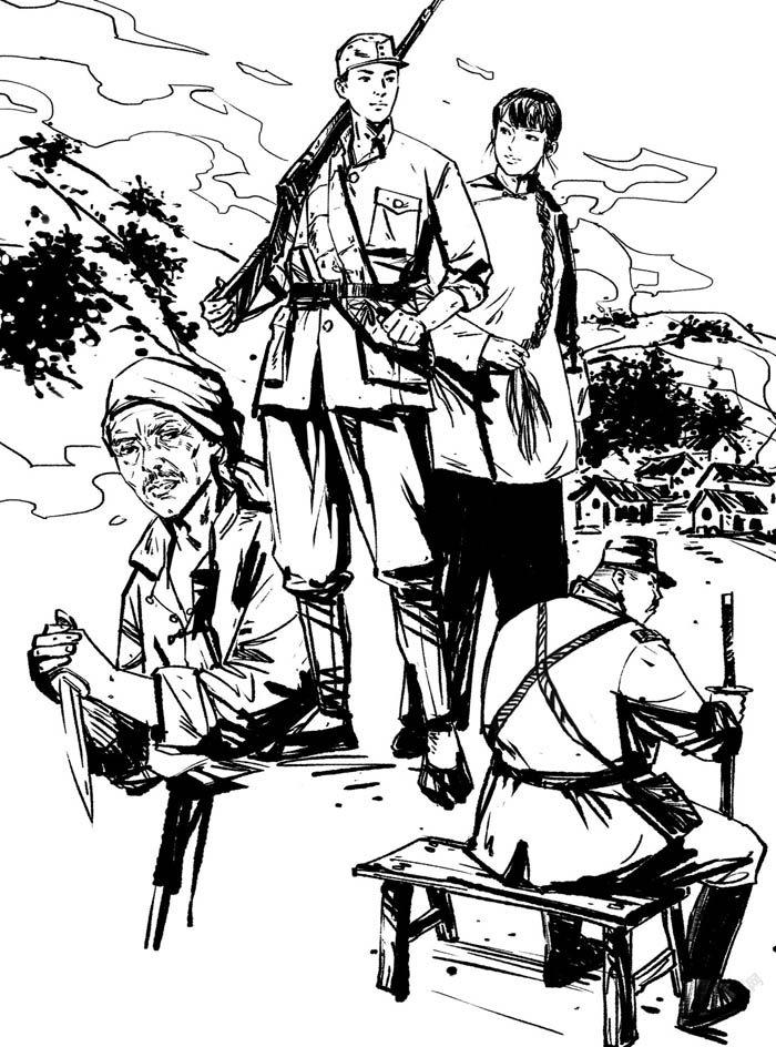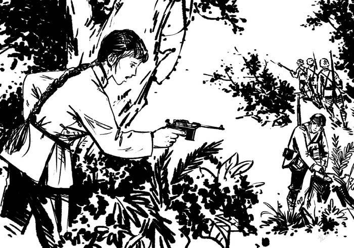 日伪军一面放枪,一面向前行进。此时,有两个人正在山脊上变化着位置打击鬼子。他们正是冯老汉和他的儿子冯生。