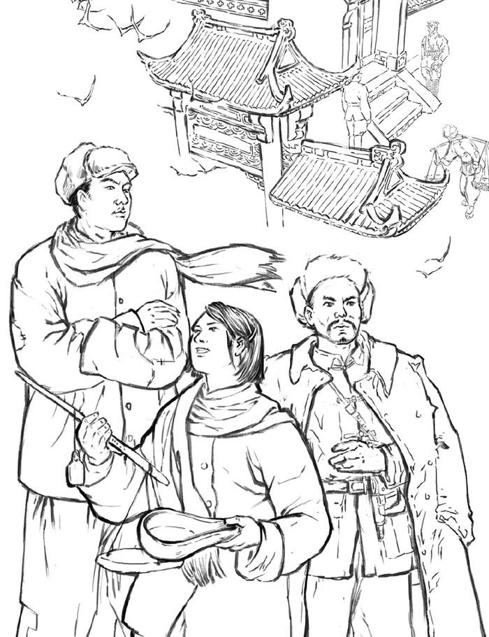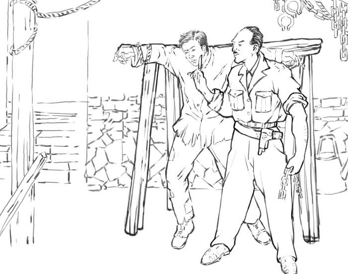 日本宪兵队门前,两个穿着黄皮子大衣、斜背大枪的日本宪兵在站岗,抄着棉袄袖子,缩着肩膀,在门前的暗影里走来走去,炮楼里的灯光将他们的影子无声地拉长,像两道鬼影。