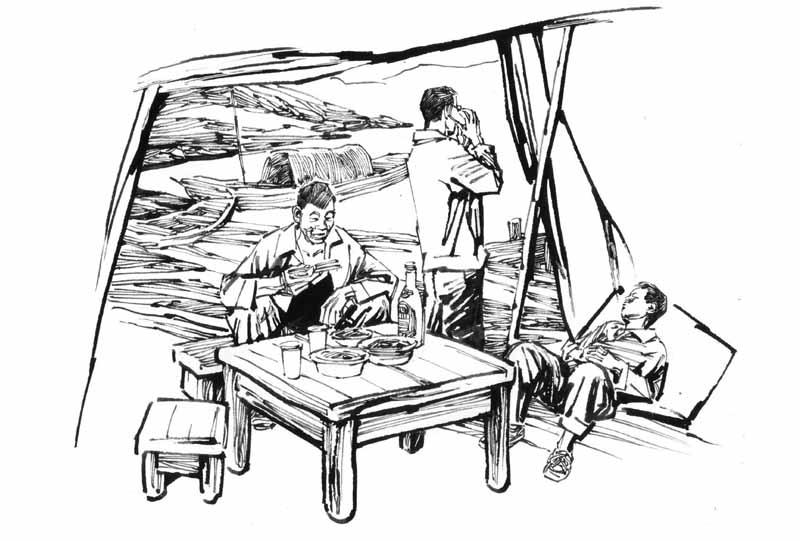 地势越来越高,峰峦秀丽,瘴雾弥漫,农民指给他看,在蜿蜒盘旋的山路下面,可以看见一条江水横穿山峦,远处依稀可见有几处临建的窝棚,那就是渡口的南头。