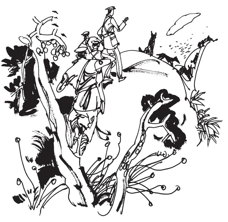 王海波先去昨晚的枪战现场看了看,再次确定不会死灰复燃后,一路标记哪片山林生病需要医治,哪片山林可以砍作木材重换新木,又去那几棵百年古树和国家级保护植物看了看,这一圈走下来需要一个星期。山里哪里有什么动物,哪些动物的家在哪儿,他比对自己的家都要清楚。有时候狼群也会跟着他们,一群穿红色衣服的兵和几只狼在山中穿行,风景那是别样的美。