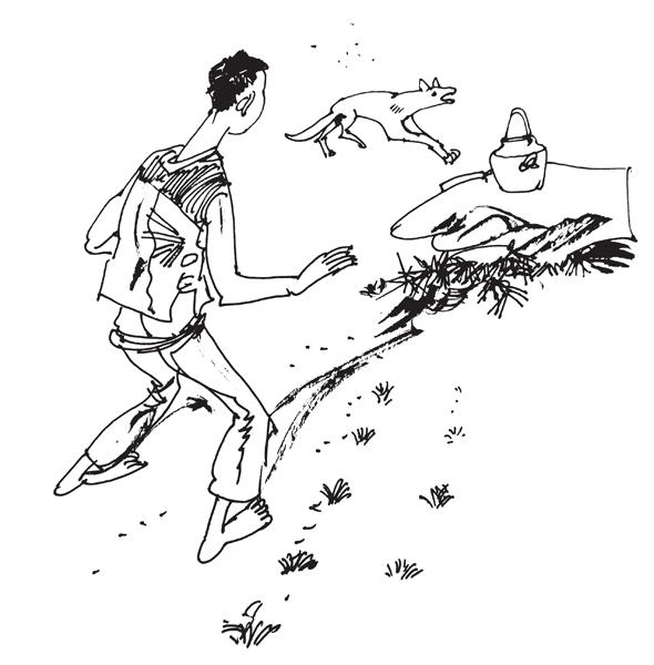 到了中午,五叔让我去拿水罐,我揉着酸痛的胳膊往地头走。还没等走到地头,就听到有响动,等我走出玉米地一看,一只青灰色的母狼脖子上套着水罐正焦急地在地头上来回乱窜。我立即明白了,它一定是想去吃水罐里的米饭,结果因为罐口小,卡住了头,拔不出来了。水和米饭洒了一地,我正不知所措时,身后响起了五叔的声音:“你在那儿傻愣着干啥,还不拿扁担打它。”这才提醒了我,我抡起扁担向狼的头部打去。只听“咣当”一声,卡在狼头上的水罐打碎了,留下一圈水罐脖儿还有一条我系在水罐上的红腰带。狼一惊,带着这些家什跑掉了。五叔在后面不停地埋怨我,说我什么事也干不了。我很难过,那条腰带,是妈妈为我过生日,用苎麻和马尾花了半个多月的时间才编成的。