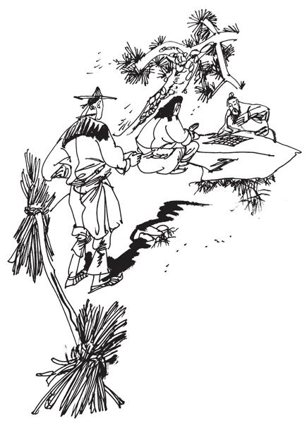 樵夫走近岩石,放下扁担、柴绳,一时间,忘了进山砍柴的事儿,他坐在一旁观棋,为妙棋叫好,为败子叹息。
