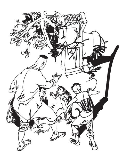 村民们突然从四面八方冲出来,高声叫着,敲打着脸盆、锣鼓,挥舞着扁担、铁叉。猴子们慌了神,想往回逃,路被堵上了,只得往村子另一头跑。