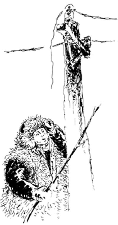 两个俄国兵一人扯着电话线的一头,往电线杆子上爬。为了尽快完成任务,他们向上爬之前,摘掉了背着的大枪,脱掉了羊皮大袄,扔在一旁,輕手利脚地向上爬去。