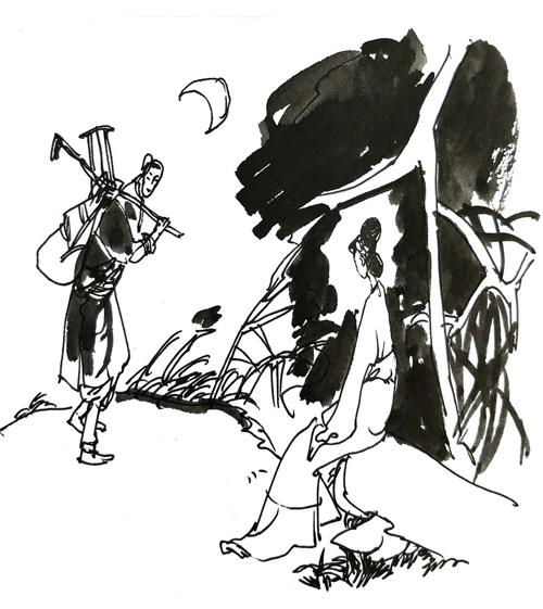 借着火光,小木匠看到不远处站着一个美丽的女子,正在脉脉含情地注视他。在这荒山野岭,深更半夜的怎么会有女人呢?于是他不动声色地说:“我迷路了。”