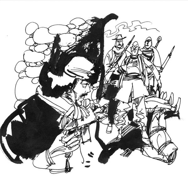 这一天到了敦煌,安营扎寨。晚饭后,十王爷在大帐里和师占魁谈兴正浓,突然几排冷箭射倒了大帐门口的士兵,闪进几个持刀仗剑的人。十王爷身边的护卫急忙仗剑挡在十王爷前面,厉声喝骂。十王爷倒是镇定,喝问:“来者何人,意欲何为?”