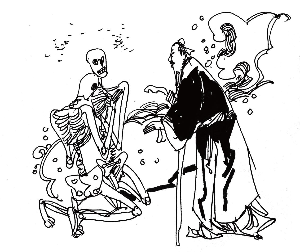 两具骷髅大喜过望,各领取一粒药丸,作别仙人,分两个方向而去。临行前它们约定,不管结果如何,最后仍须回到墓畔会合。