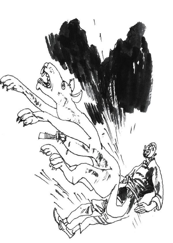 猎人只好伸出左手任他舔。他觉得,在舌头接触皮肤的一瞬间,一种甜蜜和幸福立刻涌上心头,差点儿融化了他的杀机。这时,另一种声音提醒自己,你想活命吗,就得有杀心!猎人心头一颤,在恶念驱使下,将刀刺向狗的胸膛。