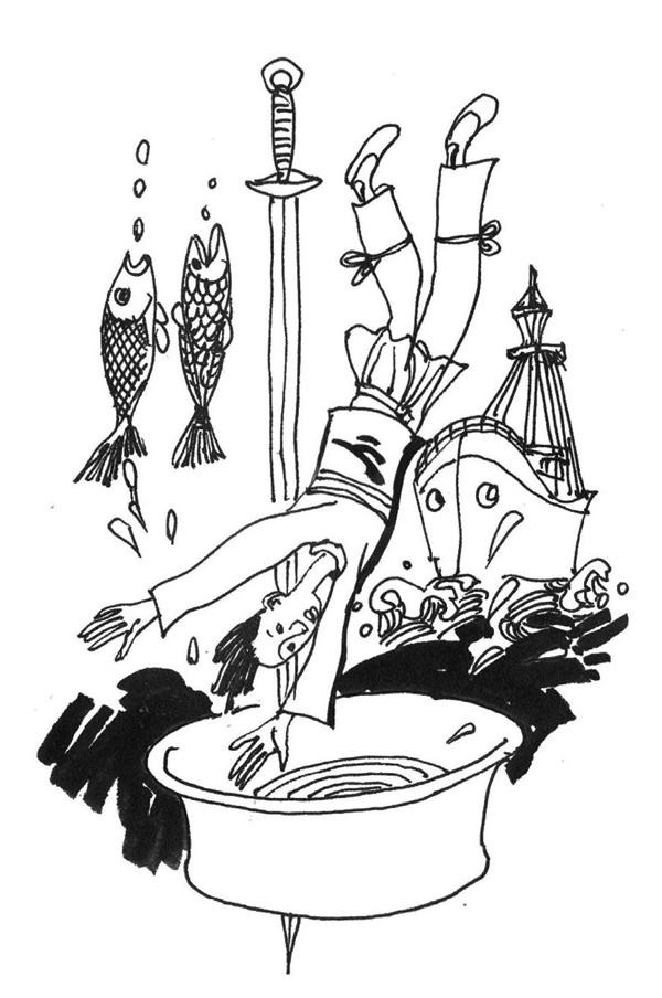 他换上了熟牛皮的紧身衣,这是潜水的装扮,抬胳膊抬腿,没有半点儿绷挂感。他开始在房间里转圈奔跑,每跑一圈,身子就缩小一号。在长途奔跑中,他终于缩小为巴掌大小的小人,他的牛皮潜水服也在随着身子缩小,包括他背后的宝剑,也按比例缩小了,成为牙签似的一小段铁锥,剑柄的红穗在右肩上摇摇晃晃。
