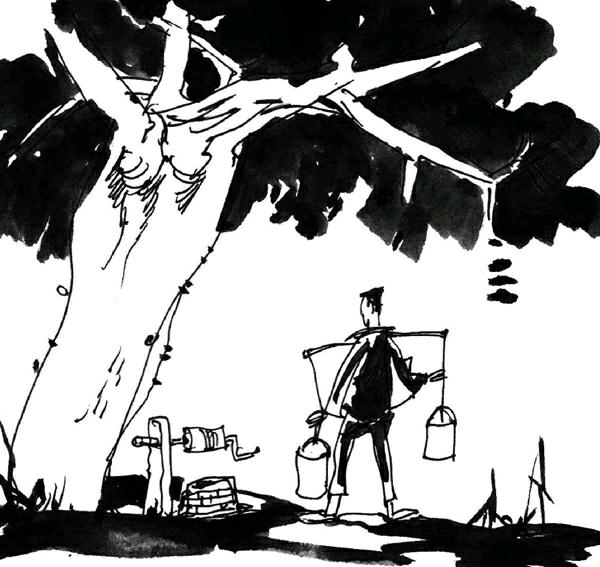 一个秋日的清晨,一个年轻的村民像往常一样,早晨起来第一件事,就是在一根扁担两端的钩钩上挂上了水桶,然后就挑着扁担走出了家门,到村中一棵大槐树下的水井旁汲水。