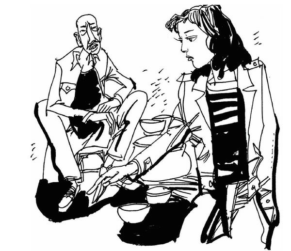 这天傍晚他正收摊,来了个漂亮女郎,踢踢他摊前的一只纸盒子:“喂,老板,你的东西落下了。”