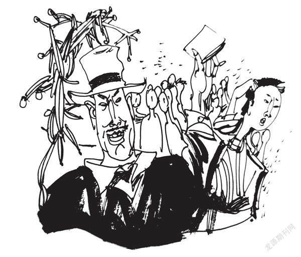 他把礼帽举得高高的,让观众看看,里面什么也没有。然后把手绢放进去,转动一下,帽子里竟然变出了一个皮夹子。