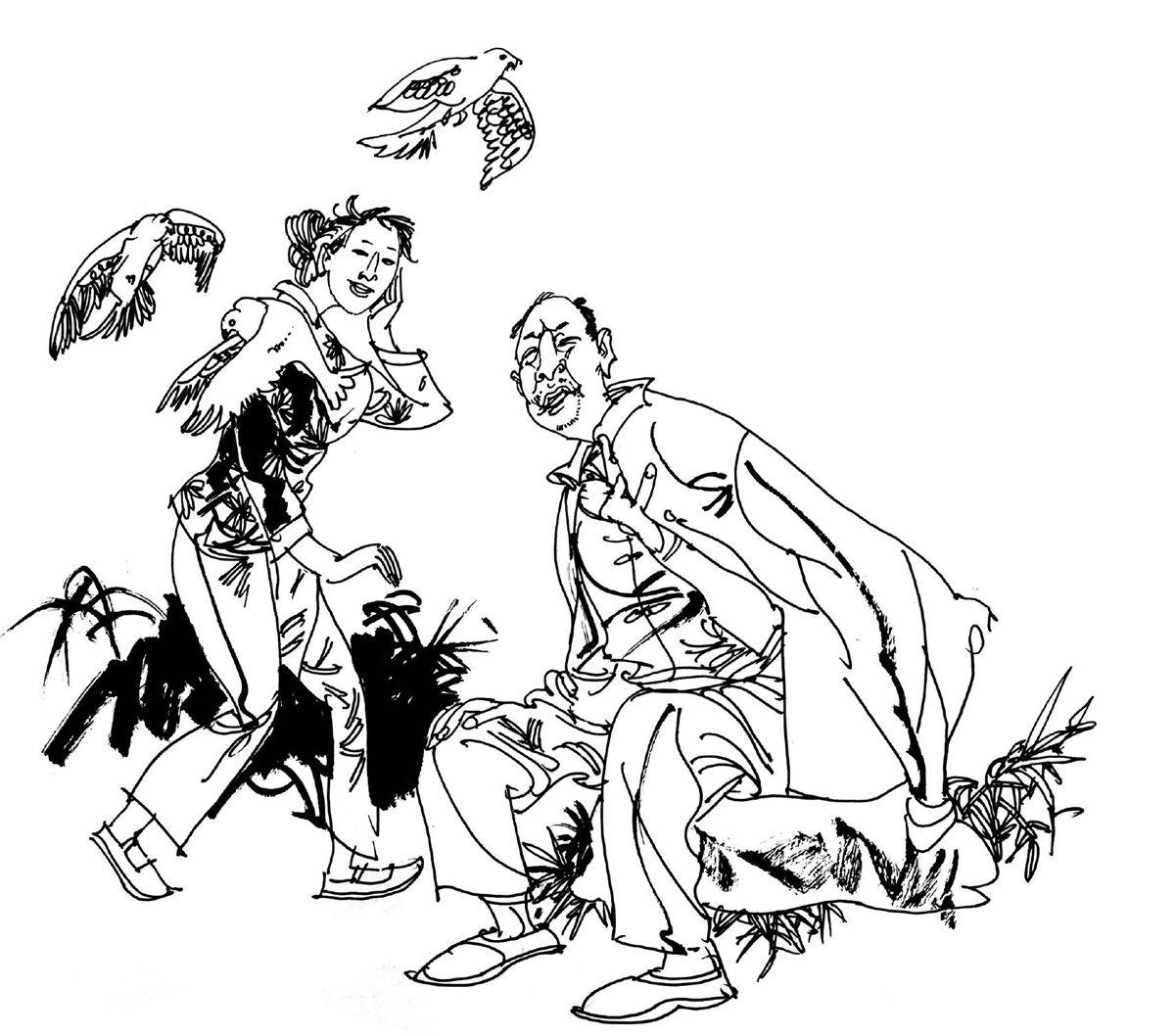 马豆根童年读过私塾,识文断字。他把鸽子分三色驯养。黑鸽专往男家送信,白鸽专司女方传音,一旦男女双方同意,花色鸽专送由他裁定的订婚通知。平时,他拄着拐杖,游乡转村,肩上卧着信鸽,一来采集各村男女婚姻信息,二来调教信鸽飞行路线。回到家,张家女,李家男,生辰八字,秉性特点,一一记在本上。但凡送信儿,把黄裱纸裁成巴掌大,毛笔写清,装进用竹子制成的小竹管,绑在鸽子腿上。三五年下来,马豆根便有了“飞天红娘”的神誉。