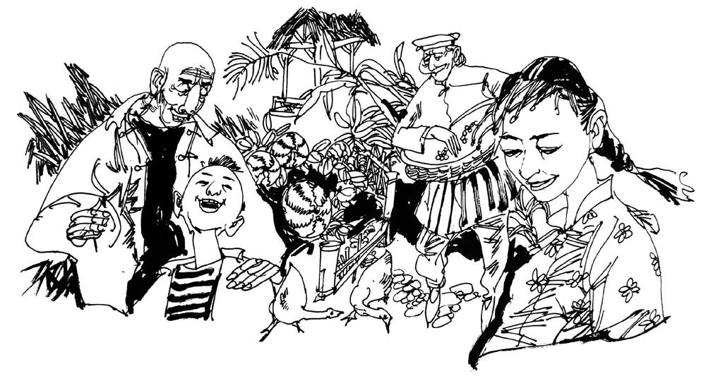 有一回,他听到玉米地里有“窸窸窣窣”的声音,仔细查看,原来是一个光屁股的小孩儿在掰玉米呢!身子和玉米秸一个颜色……外公老用“哎呀”“你不晓得”这些词,还拍腿舞臂做手势。紧要处他却住了口,急眼猴儿似的我们拼命追问“后来呢?后来呢?”,我恐吓说他的草帽被小偷偷走了,他并不慌急,反指着我大笑。