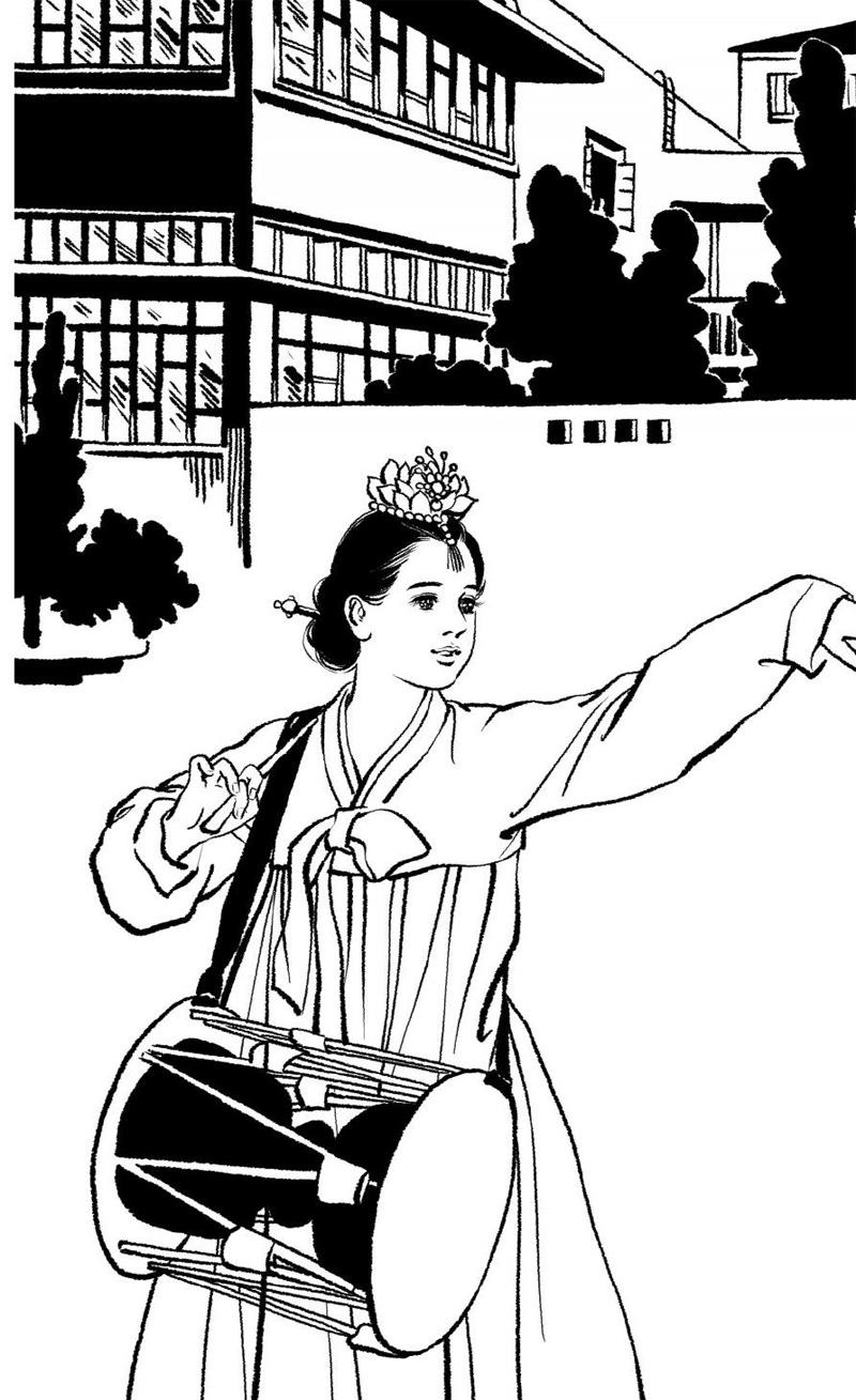 朝方二号女导游,约二十岁出头,有一张诚实的苹果脸,她教我们常用的朝语。我认真学了两句,第一句是“好”,中文谐音是“找他”。第二句是“漂亮姑娘”,中文谐音是“车扭衣不达”。团友们踊跃学朝语,车里气氛热烈。