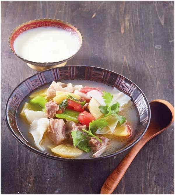 用料 250克面粉/150克羊肉/1个土豆/2个番茄/3个青椒/豌蒜、葱/适量青菜、生抽、油