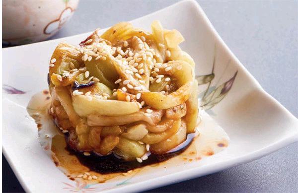 茄子洗净后擦干水分,放入预热220摄氏度的烤箱烤制45分钟。平底锅倒入适量油小火烧热,放入白芝麻炒至变色后盛出待用。料理机内放入生抽、七味粉、红昧噌酱、柴鱼海带粉、香油和50毫升清水搅拌均匀制成酱汁。烤好的大茄子对半切开,去茄皮取茄肉,并撕成条状。取一碗,放入茄条、酱汁拌匀后倒扣入盘中,撒上白芝麻、葱碎点缀即可。