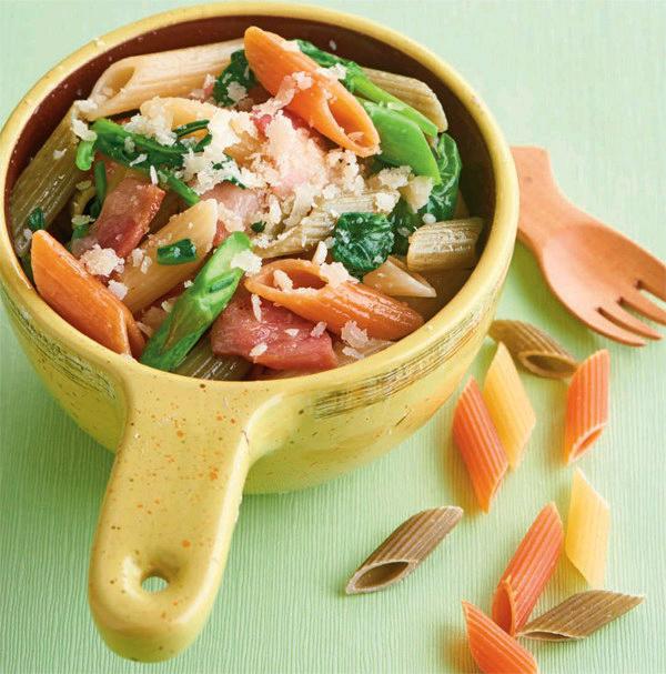 150克意大利通心粉、75克培根、250克芦笋、100克菠菜、60克帕玛森奶酪粉、2克白胡椒粉、盐
