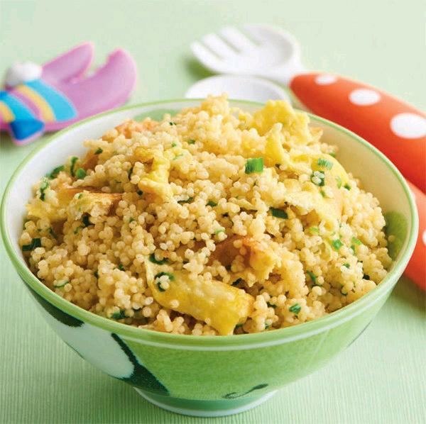 锅内留底油烧热,下葱碎炒出香味,放入蒸好的小米快速翻炒,再将炒好的食材回锅翻炒均匀,最后加盐调味即可。