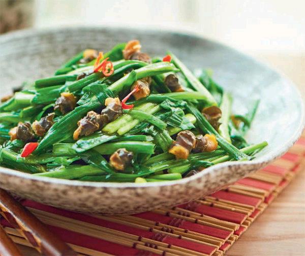 炒锅内倒入适量油烧热,下姜丝炒香,放入韭菜段、盐快速翻炒,倒入处理好的螺肉,调入生抽翻炒均匀即可。