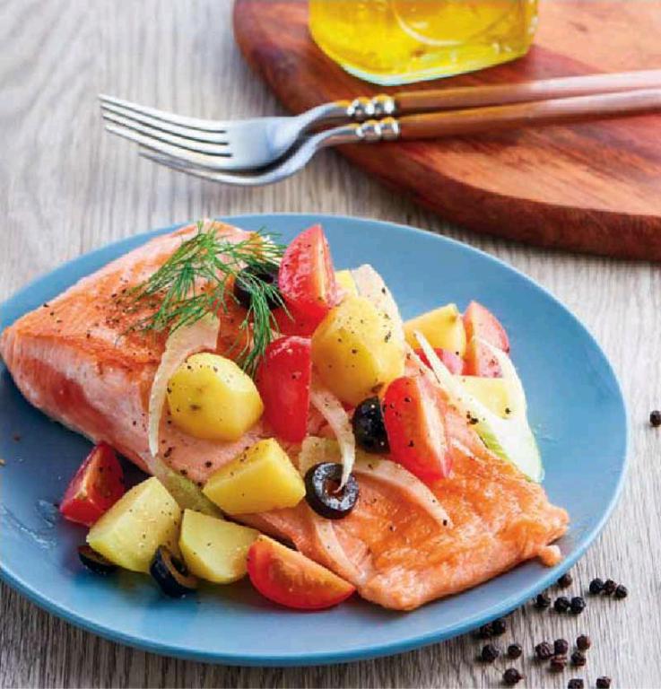 ·平底锅倒入剩余橄榄油烧热,放入腌好的三文鱼,每面煎制2分钟后摆入盘中。最后,放入调制好的沙拉即可。