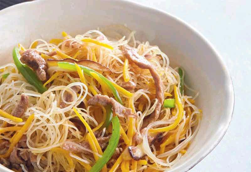 锅内留底油烧热,下青椒丝、香菇片、南瓜丝炒匀,注入少许温水焖煮2分钟,放入米粉和炒过的里脊肉丝,调入盐翻炒至熟即可。