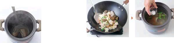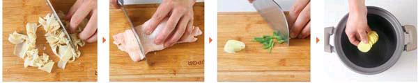 6.苏泊尔陶然养生煲内注入适量清水大火煮开,放入鸡块、笋干段、葱碎煲煮,再加入甜豆炖煮至熟。