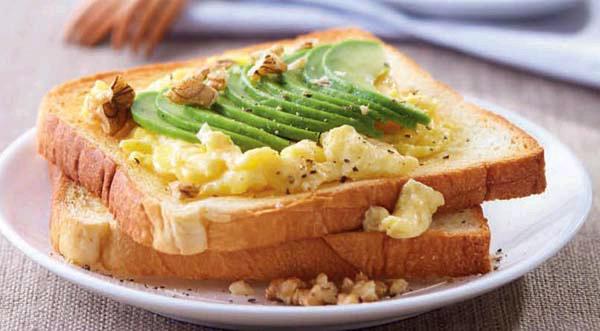 2片吐司2个鸡蛋1个牛油果10克黄油1汤匙牛奶适量坚果碎、盐、黑胡椒碎