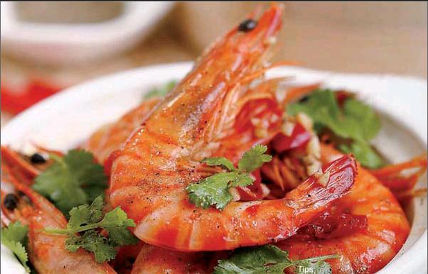 500克大虾/1茶匙料酒/适量盐、鸡精/少许葱段、蒜末、姜末、小红辣椒末/适量油