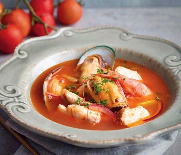 倒入鱼汤和罐头番茄,放入藏红花、橙皮、月桂叶和百里香,大火煮开,加盐和黑胡椒碎调味,转小火煮15分钟,放入鱼块、青口贝和海虾继续煮8-10分钟后盛出,撒上欧芹末即可。