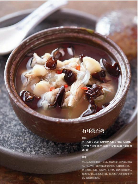 庐山石鸡,江西九江市的一道名菜,是以庐山“三石”之一的石蛙为主料烹制的一道佳肴。先将石蛙斩去头和爪尖,去皮去内脏后洗净沥水,放入盆中,以葱椒盐、酱油、料酒、味精、生姜、葱段拌匀后腌半小时。取出一铁锅,将米饭、白糖、茶汁搅拌均匀后铺于锅底,上面放一篦子,将葱叶放在篦子上,再将腌好的石蛙放在葱叶上,加盖后开大火,待出烟后改小火,将剩余茶汁沿铁锅的边缘缓缓淋入,蒸熟后再熏制15分钟。装盘时,将黄瓜段摆于盘子的中间,放上石蛙,淋上麻油即可。这道菜色泽深黄,茶香十足,一口吃下,石蛙肉质细嫩、口味甚醇,让人欲罢不能。