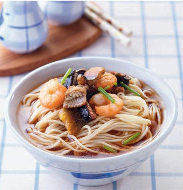 用料 150克面条/100克黄鳝/50克鲜虾仁/30克蛋清/10克葱/豌姜/1茶匙香油/2茶匙料酒/1汤匙老抽/适量淀粉、白糖、高汤、油、盐