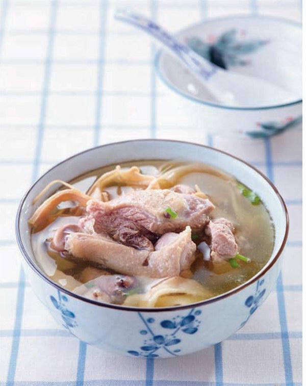 用料 700克老鸭/250克笋干/15克姜/10克葱/1汤匙料酒/适量 盐
