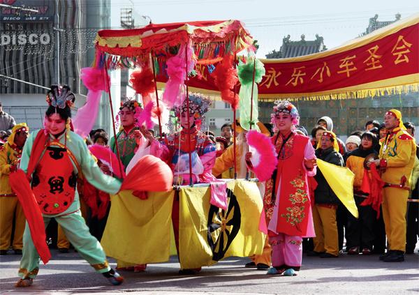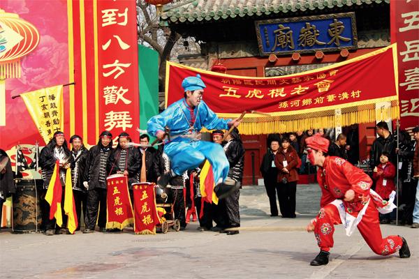 1999年开始,北京民俗博物馆恢复东岳庙庙会,邀请多档花会在庙会期间进行表演。在此基础上,经过北京民俗博物馆不懈努力,2007年的东岳庙庙会上,尘封近百年的“幡鼓齐动十三档”终于首次全聚首,包括了武术、舞蹈、滑稽表演、曲艺、音乐等类型的项目,风姿再现,大放异彩,自娱、娱人的意义越来越大,成为渲染气氛、欢庆传统节日的表演形式。