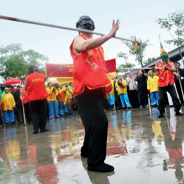 传统武会有着显著的特征,特征之一是“无祖不立”,这是因为慎终追远是中国人的传统思想,凡事喜追原始,找出源头,弄清来历,崇拜、追念、报答有功绩的先人、创始人,这种根深蒂固的观念,构成传统武会祖师信仰的思想基础。“幡鼓齐动十三档”的各个会都有自己的祖师,比如开路的祖师是地藏王菩萨,中幡的祖师是真武大帝,五虎棍的祖师是斗战胜佛,鲁班是石锁、杠子和双石头三个会的祖师等;另一个特征是行香走会一般在庙宇内外举行,这是因为庙宇有作为象征通天贯地之莫测神灵的偶像,与法器、建筑共同构成了一个神圣空间,在这个充满神圣感的空间里,人们可以通过直观、具体的形式和行为与神沟通,完成通神达道的目的,所以“幡鼓齐动十三档”走会的终点必定是庙宇。