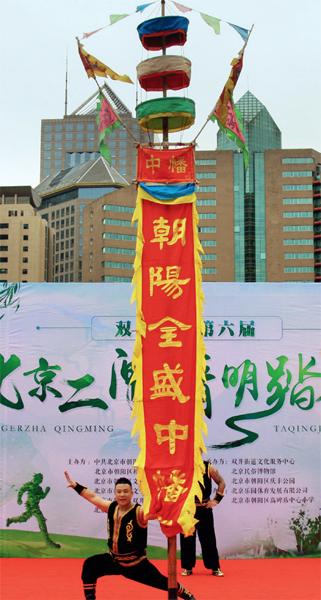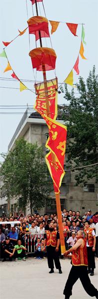 中幡起源于皇室仪仗队的旗杆,后演变成民间庙会中的表演节目。俗话说:“天桥中幡三丈三”,作为老北京文化的缩影,北京天桥中幡已成为首批国家非物质文化遗产名录推荐项目,被世人关注。