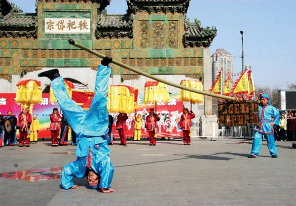 杠子会表演又称“盘杠子”或“翻杠子”,把木制的杠子固定在骡马拉的大车上或地上表演,边走边练。说到杠子,不能不提天津的杠子。清代,最为盛行的是天津的杠子。天津作为河海衔接的都市,为支应驳运漕粮,揽接往来商货,经营内河运输,聚集了众多的船户、水手、纤夫、搬运脚夫,力量与技巧并重的杠子等项目,成为他们最拿手的本领。