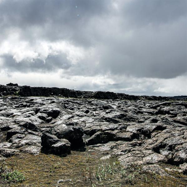 走出城市,眼前很快就是一片苍茫的景象。冰岛有300多座火山,享有“极圈火岛”之名。在层层叠叠的乌云下,火山群张着血盆大口,遥远地伫立着,从山上往下放射着黑色的滚石,仿佛是火山的裙子。这些大大小小的岩石虽然早已覆盖上厚厚的火山灰,却仍在棱角处显出了犀利,纵横交错在一起,不难想象当初天崩地裂、火球滚动时的壮观景象……