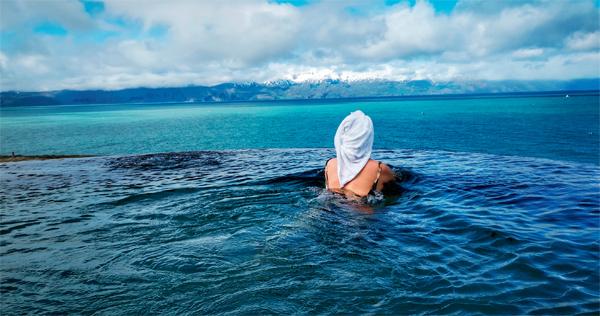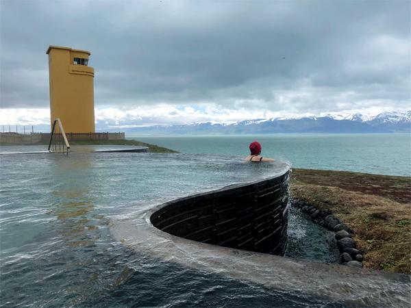 我们爬上面海的高坡,橙黄色的灯塔就立在山头,每当夜晚灯光就会开启,为出入港的船只指示着航路。灯塔旁边,有一处堡垒式的建筑,我们好奇地往里走,原来那是一个高檔温泉俱乐部的入口,换衣间、洗浴房、咖啡厅一应俱全。尤其难得的是,室外温泉池就在大海边,溢满池的热泉与海水几乎无缝接壤,远看只是半圆的池蓝浮在无边的海蓝之上,美妙之极。我和同伴大喜,匆匆回家取来泳衣,然后急不可耐地扑进热泉之中。