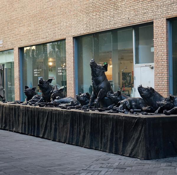 可惜的是当时我没有找到入口的通道,就顺着馆楼旁侧的道路,沿着馆楼游览。馆楼旁侧是连排而立的深灰色建筑,道路的中间还立有一些现代雕塑,尤为对一处的雕塑印象深刻:几只形态各异的猪模样的动物在一条长桌边上,桌上散落着食物和器皿,当代艺术品的前卫感十足。