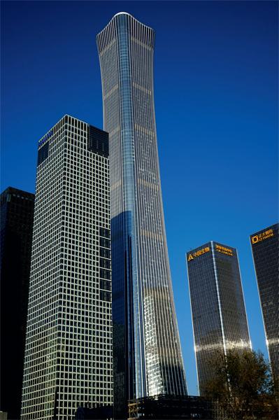 如果说中央电视台新台址以它的设计而闻名,那么在它东南方向的中信大厦则是以其高度而闻名。高达528米,中部略收、两头略扩的双曲线建筑造型,与中国传统礼器之重宝——“尊”的意象十分相像,所以也被形象地称为“中国尊”,它在2014年被评为“中国当代十大建筑”。