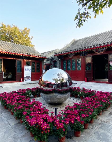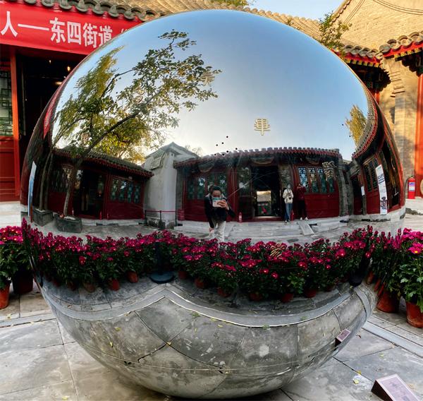穿过垂花门和印象瓦舍,再往里走,就进入了四合院的第二进院落了。第二进院的正房和两侧的厢房,都是展室,但庭院的装置再一次让我屏住呼吸,震撼感直逼脸颊。这里的空间布置了一个大规模的不锈钢公共艺术品——月影,与传统的胡同院落相呼应着,创造出过去与现在的对话。听馆内工作人员介绍,这个创意来自于中国古代重要的观测天象仪器——浑天仪。东汉伟大的天文学家张衡发明了世界上第一台可以观察天体运行的水运浑天仪,浑天仪由多个环形构成,各环形上分别刻着内、外规,南极、北极、黄、赤道,二十四节气,二十八星宿等天象。而“浑天说”则是中国古代的一种重要宇宙理论,认为“浑天如鸡子,天体圆如蛋丸,地如鸡中黄”,天内充满了水,天靠气支撑着,地则浮在水面上。”