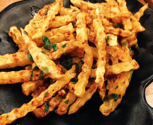 在云南,土豆也叫洋芋,如果你问一个云南人最爱吃的小吃是什么?答案一定是洋芋。云南人会把洋芋做成五花八门的美食,老板为我们介绍了昭通洋芋鸡。昭通是云南的一个地名,既然做云南风味餐厅,老板希望能把云南各地的代表美食都融合在一起,每个地方特色都会选一两道有代表性的小吃,昭通洋芋鸡和麻辣土豆条就是昭通地方特色。洋芋要炖得软糯入味,鸡肉切成小块,搭配云南特色的香料小火慢炖两个小时以上,才能做出这一道美味的洋芋鸡。炸洋芋条在云南随处可见,云南人喜欢吃油炸的食物,如油炸粑粑、油炸牛干巴、炸乳扇等等,但是最受欢迎的还是炸洋芋条。炸至金黄的洋芋条,撒上辣椒,还能搭配云南特有的蘸水(云南特有的蘸料)。云南人认为什么食物都可以用蘸水,就连水果都可以用,我曾经体验过吃生芒果蘸水,口感那叫酸爽异常。
