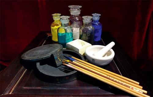 勾画所用的工具主要是毛笔,拿着毛笔将之前在泥坯子上刻的纹样勾出来:眼瓦、鼻窝、嘴角的花紋。花纹讲究规整、色彩明丽、线条流畅、位置准确,所以在勾画时通常一下笔就没有改的余地,也就要求手艺人的勾画功夫深厚。勾完后就用颜色涂绘点、线、面,其中唐家脸谱只有黑红上清漆,这不仅是区分精品和外行货的标准之一,同时也是脸谱形成亮泽明净、浓淡分明的重要因素。为了保证脸谱上的颜色匀称、持久度长,颜料都是由林泓魁他们购买之后再加工。等到整个脸面的谱式完成之后,将髯口、盔帽和脸谱进行最后的组装。
