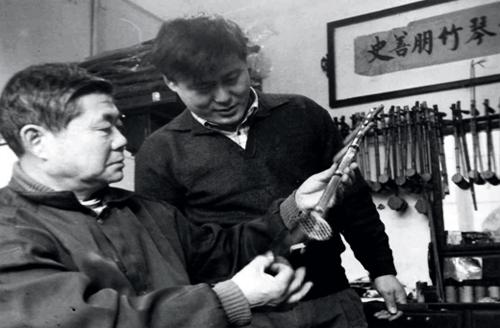 史派京胡制作技艺传承第二代传人史志贤向其子史优生传授京胡制作技艺。