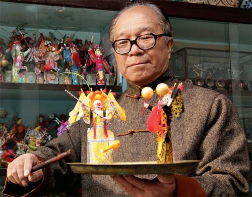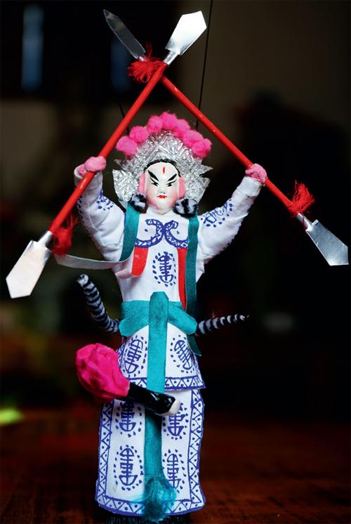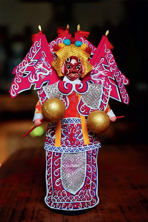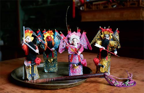 白老师坐在工作台前的椅子上,虽已过古稀迈入耄耋之年,看上去身体仍是十分硬朗,精神矍铄。旁边的木柜子上摆放着白老师收藏的老北京玩意儿,其中插着靠旗,手拿刀枪的戏装小人是白老师的亲密“好友”,也是我此次拜访的目的。