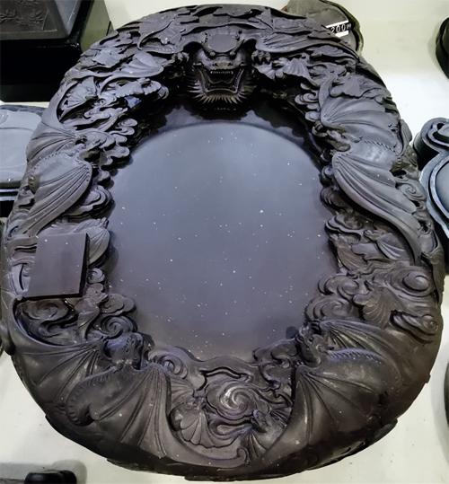 《仿旧端石六龙砚》为天然椭圆式,砚面周边刻六龙,在云气间回环升降,如龙戏珠,中间稍平坦,为受墨处,上方云龙之间,微洼,为墨池。材质细而润,构图和刻工精细,惟妙惟肖,美轮美奂,与原作比肩称雄。