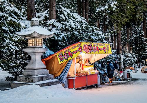 我刚到北海道神宫的时候是下午4点,札幌的天就已经快黑了。当时公园里的路灯还没有打开,我在暮色之中走着,突然发现前面有一片特别亮的地方,非常好奇地走过去看,竟然是卖鲷鱼烧和章鱼小丸子之类日式小吃的摊位,简直就是饥寒交迫的我的救命之光。北海道公园如果没有雪,大概只是一个平平淡淡的日本公园吧,但是这枝丫上的积雪,石阶上的积雪,鸟居上的积雪,再加上暮色这位大自然调色师的滤镜效果,瞬间就唯美了起来。