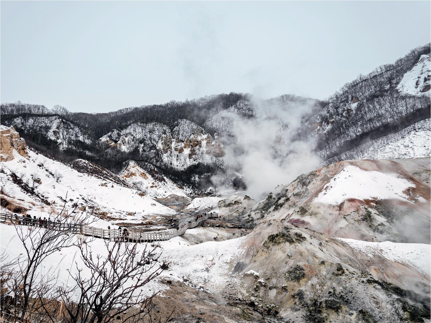 登别的温泉水都来源于地狱谷。在登别有一个叫俱多乐湖的地方,它是曾经火山喷发的遗址,现在成为了一个火山湖。而在它旁边的地狱谷则受到火山喷发影响,火山喷发后熔岩形成了现如今的神奇地貌,仿佛外星球般凹凸不平,颜色各异。虽然现在火山已经停止喷发了,但是空气中仍充斥着硫磺的气味。地狱谷的地面有很大一部分都是深黄色的岩层和黑色的石块,与白色的积雪形成了鲜明的对比,而从地底冒出来的热气把地狱谷氤氲得如仙境一般。正是由于这种特殊的温泉水质,地狱谷孕育出了大量的温泉旅店,成了著名的温泉乡。